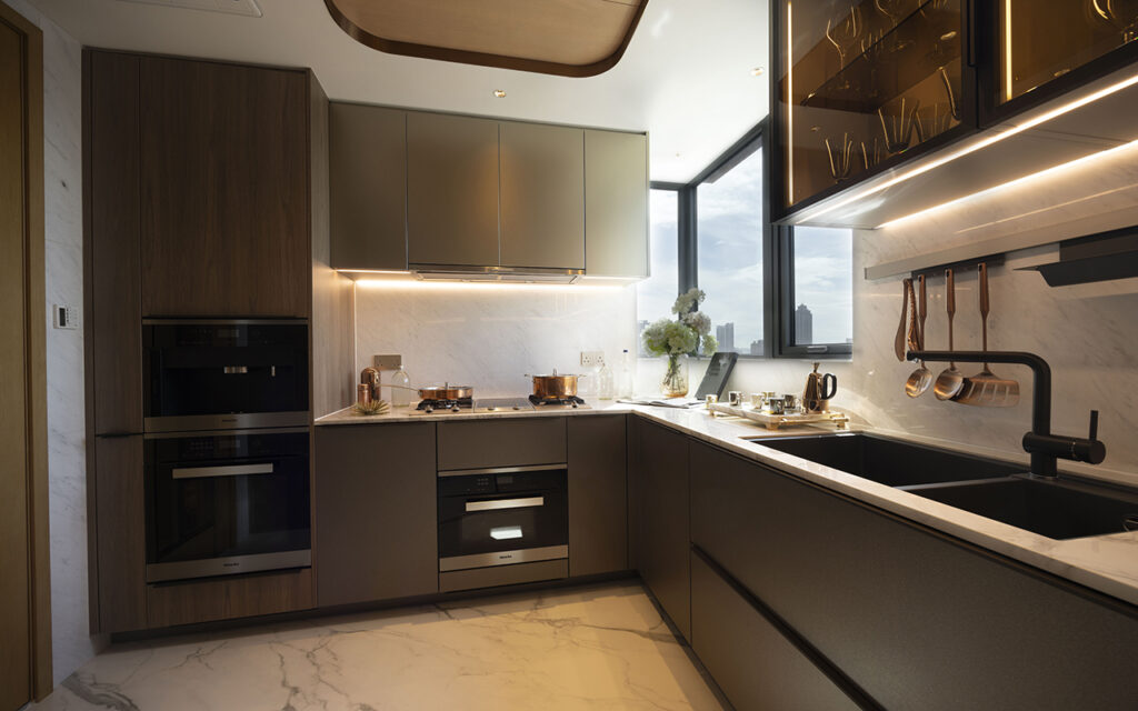 Meanwhile, in the kitchen, the original worker’s room has been removed to enhance the kitchen’s practicality and spatial feel. The kitchen door and cabinets have been replaced with transparent glass to create a more open atmosphere and the kitchen comes equipped with Miele dishwasher, Sub-Zero double-door refrigerator, wine cooler, oven, and an independent air conditioning system.