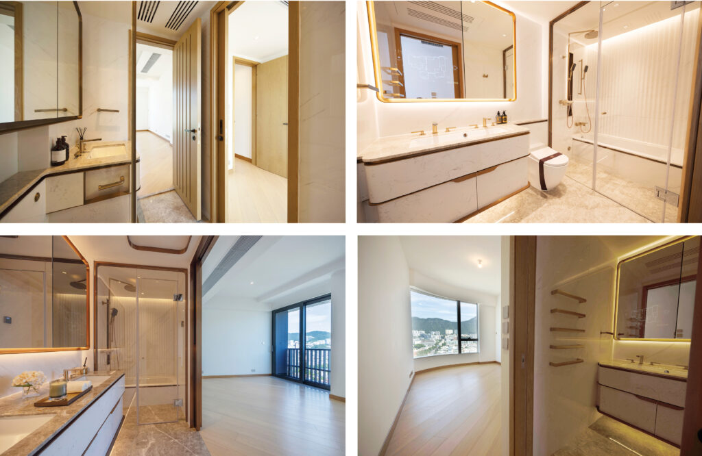 The master bedroom features semi-transparent tempered glass sliding doors for increased natural light and transparency. The design incorporates separate wet and dry areas, improving space allocation and enhancing family living functionality. The shower area is equipped with a steam machine for relaxation, and features a heated towel rack and underfloor heating system.