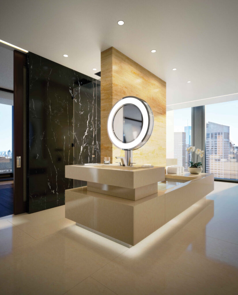 In the master bedroom, the emphasis shifts to indulgence and retreat. The en‑suite bathroom is graced by Verona limestone slab floors and golden travertine feature walls, creating a spa‑like atmosphere high above the city. The bathtub itself is generously scaled, inviting long, unhurried moments of relaxation. In a city that rarely slows down, this private refuge offers a rare sense of stillness.