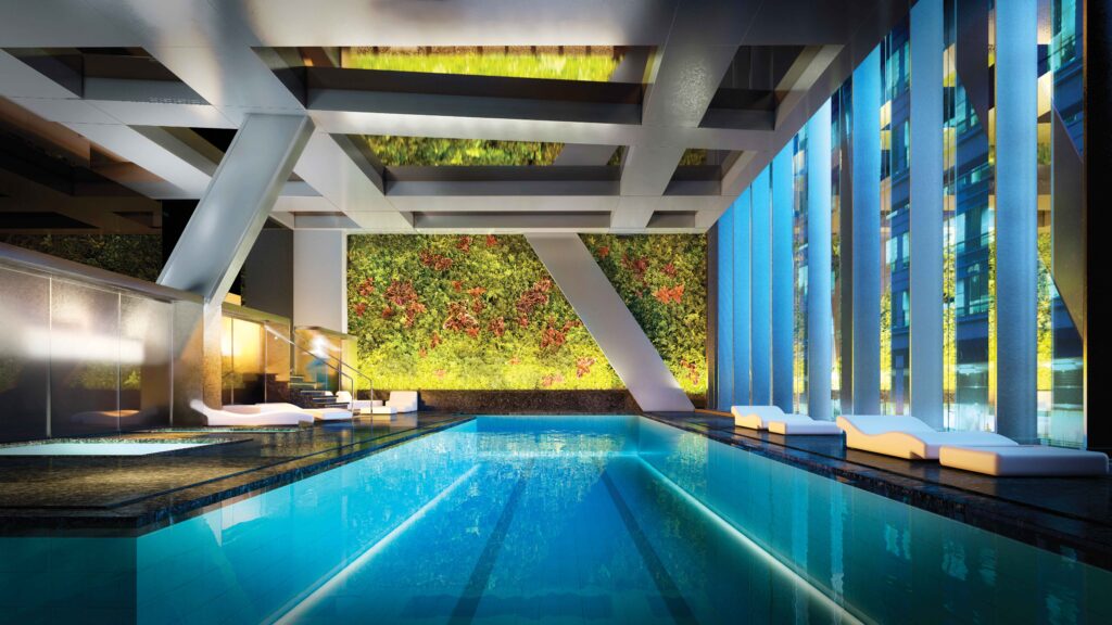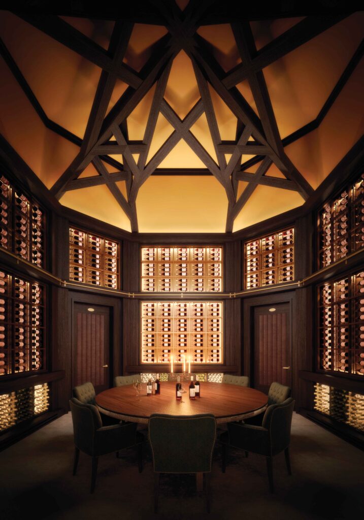 The 53 restaurant, presenting elegant contemporary Asian cuisine, is situated on the tower’s ground floor. Adjacent to the lobby is a library with a fireplace – an inviting spot for residents and their waiting guests to browse on a chilly winter’s afternoon. MoMA showcases art over 40,000 square feet on the lower floors, a sunny terrace beckons on the sixth level, a fitness centre, swimming pool and golf simulator sprawl across the 12th floor, and wine-storage spaces flank an octagonal wine-tasting room whose double-height gold-leaf ceiling glistens as legendary vintages are poured.