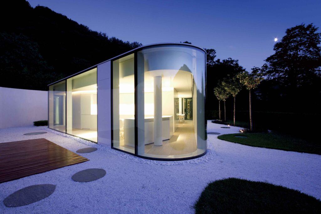 A living space featuring all‑white furniture is just the right note in a house of glass, since its classic modern elegance enhances rather than distracts from the enchanting scenery outside. While the idea of living in a glass house deep within the woods of Switzerland inspires equal parts fascination and hesitation, one glimpse of Lake Lugano House is enough to silence any doubts. Built by Milan-based JM Architecture in 2010, the home manages to feel both private and open, perched in a secluded crest overlooking the serene waters of Lake Lugano and the distant Swiss Alps. The true beauty of the living room lies in its simplicity. A few carefully placed dark throw pillows provide contrast, but nature is the artwork in this pristine interior. The room becomes a quiet stage upon which light, sky and landscape perform.