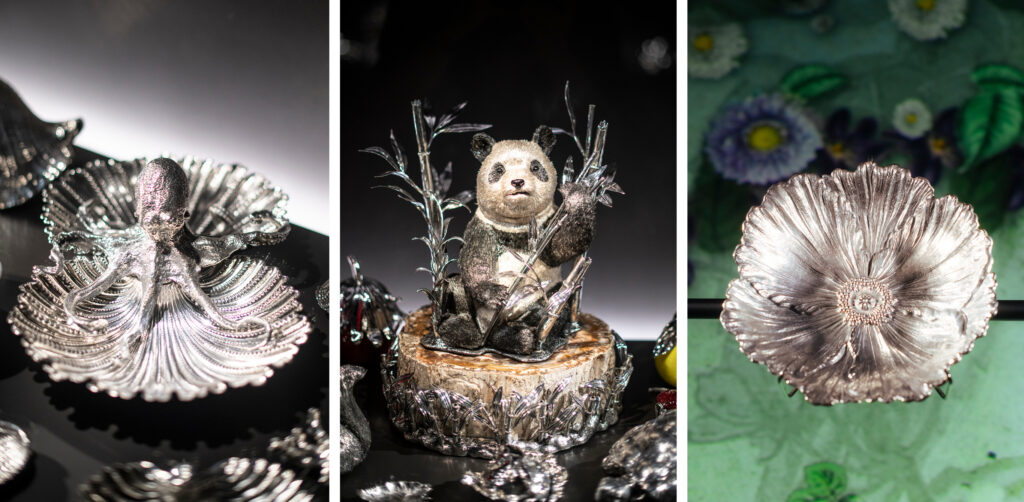 Nature serves as Buccellati’s eternal muse. This space celebrates organic beauty, featuring intricate silver pieces inspired by botanical illustrations, Renaissance paintings, and wildlife. Marvel at tableware and decorative objects that echo the elegance of the natural world, including the stunning silver panda from the Furry collection, capturing the plush charm of its subject. An immersive corridor dedicated to Buccellati’s craftsmanship reveals the tools and techniques that bring these masterpieces to life, culminating in a poetic homage through Yuri Ancarani’s film Mosaico (2023), a visual tribute to artisanal excellence.